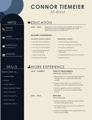 Hi, I’m Connor Tiemeier, a graduate from Northern Kentucky University with a bachelor’s degree in 3D Digital Design and VFX and a minor in Marketing. With a passion for all things design and 3D, I consider myself a generalist. I excel in modeling, texturing, rendering, and lighting, but I also have skills in game development and using Unreal Engine 5. Beyond my technical skills, I am hardworking and easy to get along with. I have strict attention to detail and am good at managing my time. Outside of the professional space, I have a love for gaming, golfing, and fishing, but creating random things is the activity I enjoy the most. I love being part of a team and working with others to complete tasks. I aspire to leverage my skills in design and 3D to contribute to an ever-growing digital landscape and be part of a hardworking and goal-driven group of individuals.